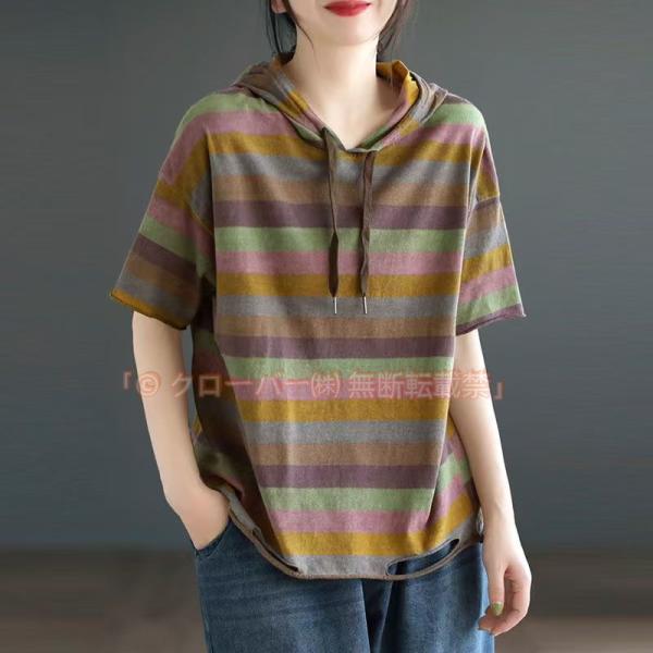パーカー 半袖 レディース ゆったり tシャツ レディース 五分袖 カットソー ボーダー柄 カジュアル トップス フード付き フェミニン 大人可愛い おしゃれ ゆったり 大きいサイズ 体型カバー 着?せ シンプル エレガント