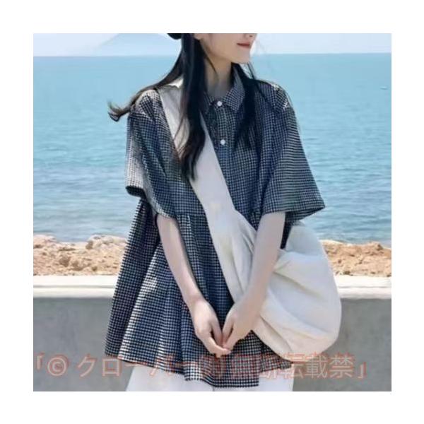 シャツ ブラウス レディース 五分袖 トップス 半袖 裾フレア ギンガムチェック 前ボタン チェック シャツブラウス 綿混 レギュラーカラー ゆったり 大きいサイズ シンプ
