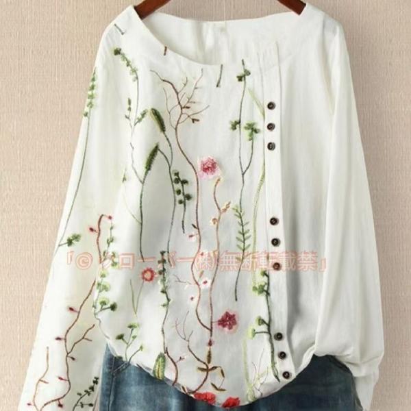 シャツ ブラウス レディース Tシャツ トップス 長袖 刺繍 クローバー株式会社 花柄 エスニック 大きいサイズ 体型カバー ゆったり 高級感 秋 春 白