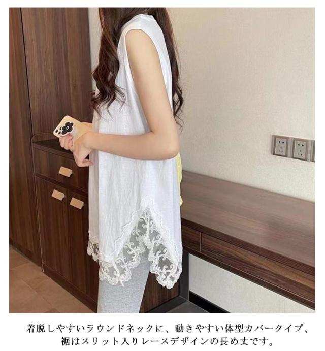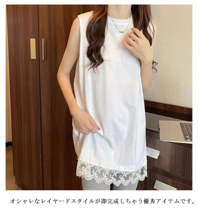 タンクトップ レディース 夏 レイヤード クルーネック Tシャツ レース裾 トップス ノースリーブ 薄手 tシャツ きれいめ ロングタンクトップ シンプル 無地 春夏 カットソー インナー 春 秋 大きいサイズ 重ね着 体型カバー レース切り替え スリット入り