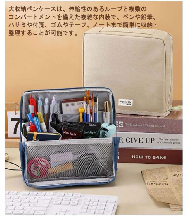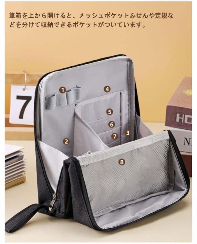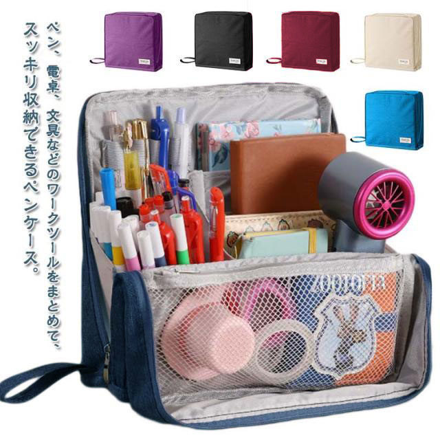 | ペン、電卓、文具などのワークツールをまとめて、スッキリ収納できるペンケース。 大収納ペンケースは、伸縮性のあるループと複数のコンパートメントを備えた複雑な内装で、ペンや鉛筆、ハサミや付箋、ゴムやテープ、ノートまで簡単に収納・整理することが可能です。 ペン類を立てて収納できるから、一目瞭然で、デスク周りがスッキリ。 ぺんホルダーがあるので、普段よく使うペンと、その他のカラーペンなどを分けて収納できます。 筆箱を上から開けると、メッシュポケットふせんや定規などを分けて収納できるポケットがついています。 また、折りたたみ部分にスマホホルダーとしても活躍できそうです。 メイクブラシなどメイクツールや化粧品をたっぷり収納できるから化粧ポーチとしても大人気です。 持ち手があるので持ち運びに便利です。 | |