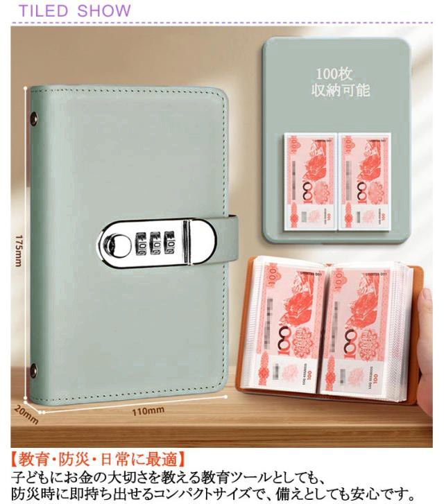 | コンビネーションロック付き!貯金ファイル 【教育・防災・日常に最適】子どもにお金の大切さを教える教育ツールとしても、防災時に即持ち出せるコンパクトサイズで、備えとしても安心です。 【お札専用だからすっきり収納】コインと違いかさばらない紙幣専用タイプで、スマートにお金を管理。整理整頓された内部構造でお札が折れずに収まります。 【軽量&コンパクトな高品質設計】サイズは11×18×2cmと持ち運びやすく、外出先や避難時にも安心。高額を扱うためのセキュアな作りが魅力です。 | |