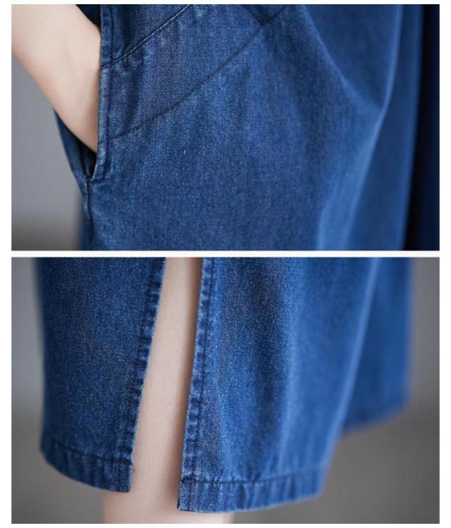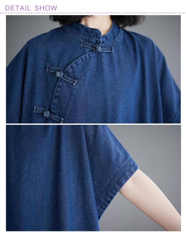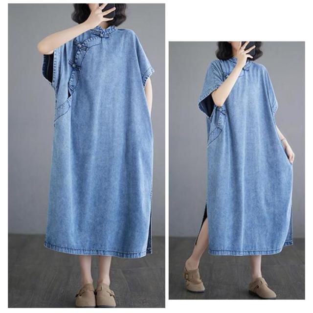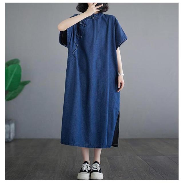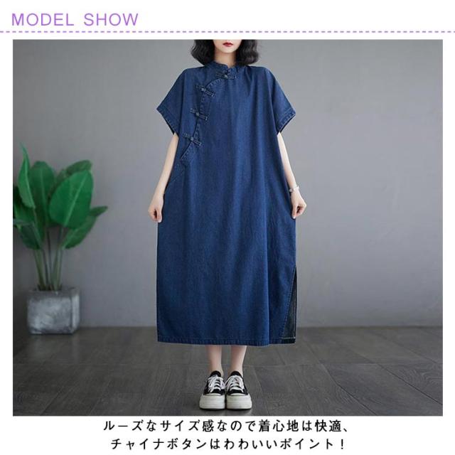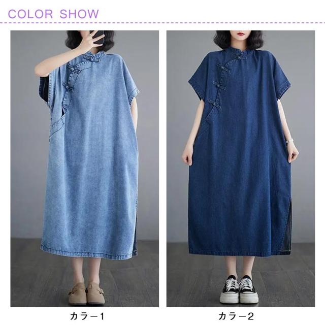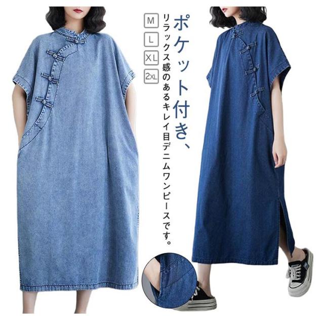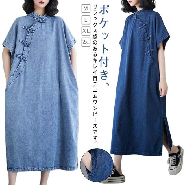 デニムワンピース ロングワンピース レディース 半袖 チャイナ風 チャイナボタン デニム ワンピース カジュアル ポケット付き 体型カバー 着痩せ レトロ スリット入り M L XL 2XL