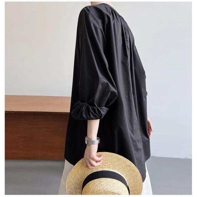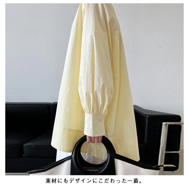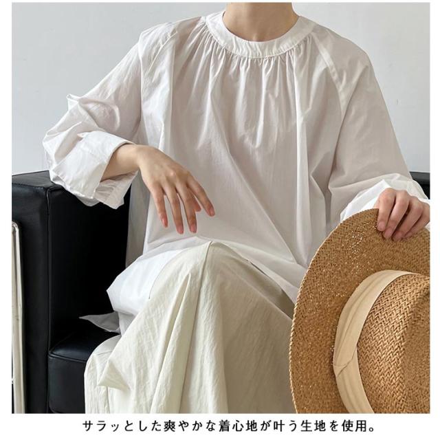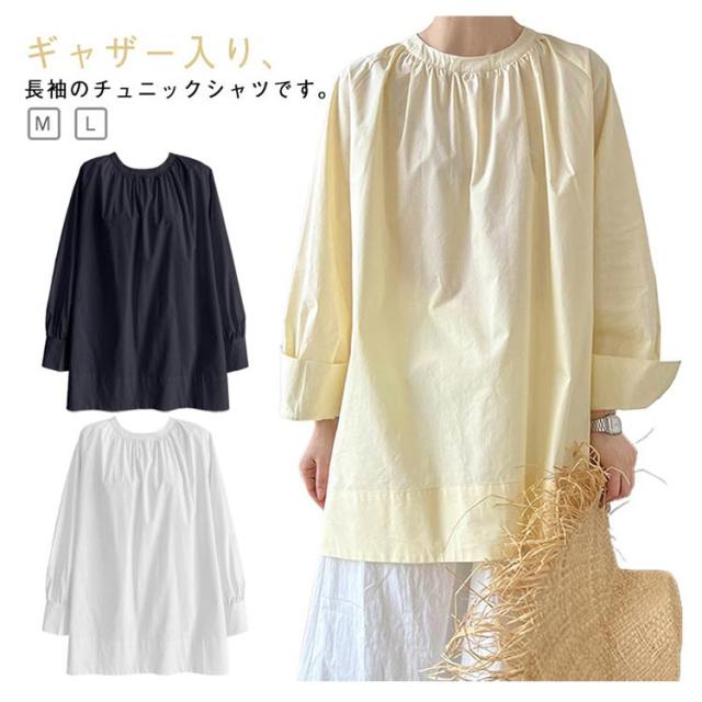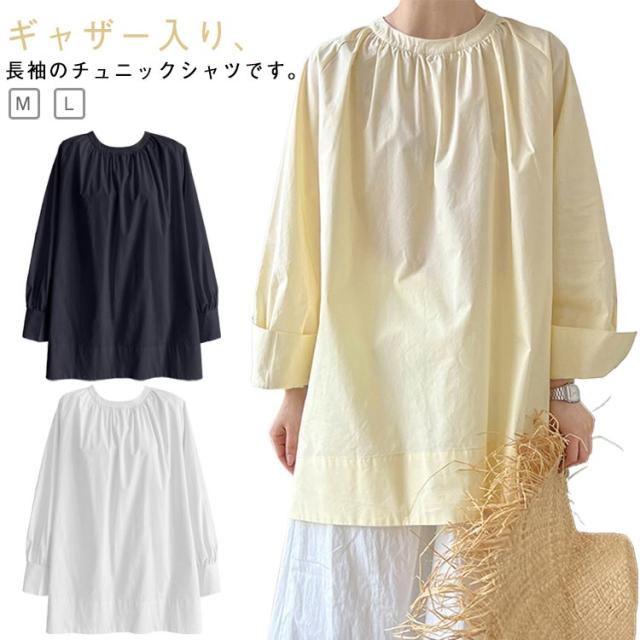 ブラウス 長袖 レディース スタンドカラー ロングシャツ チュニック ロング丈 シャツ ブラウス チュニックブラウス ギャザー入り スリット入り 大人 かわいい 体型カバー カジュアル M L