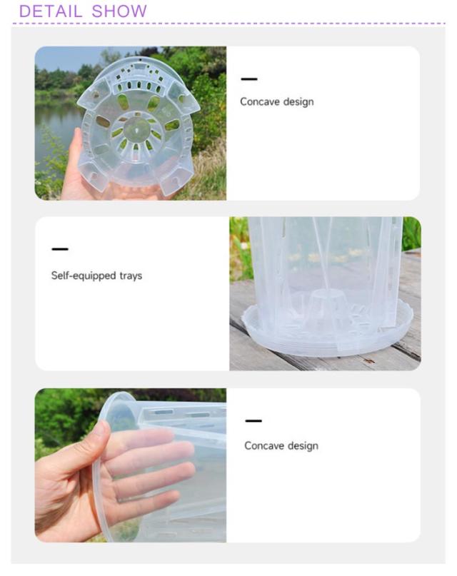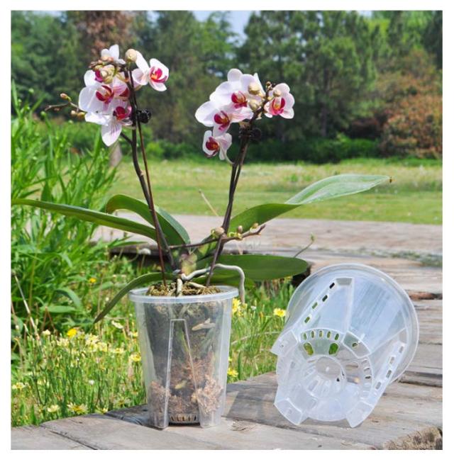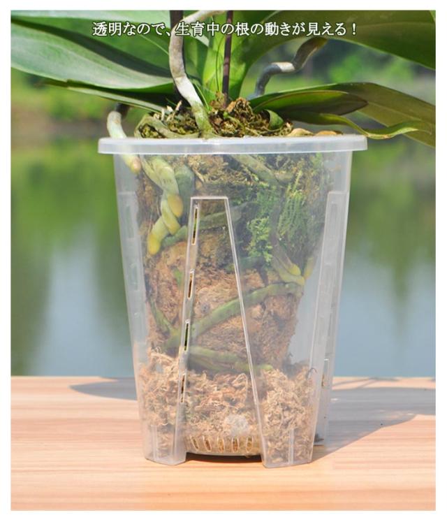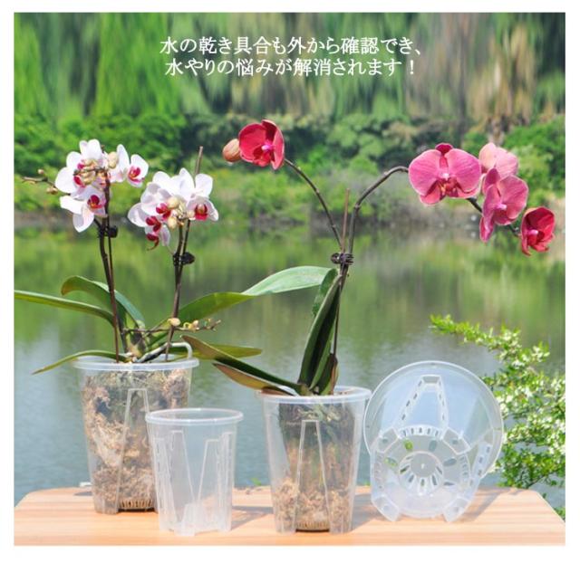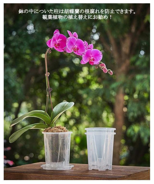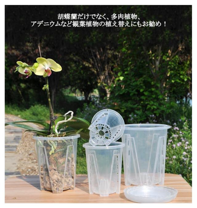 | 【胡蝶蘭用植木鉢と受皿 10鉢セット】【直径10/12/14/16cm】 鉢底とサイドに穴がたくさん空いているため通気性に優れています。 鉢の中についた柱は胡蝶蘭の根腐れを防止できます。観葉植物の植え替えにお勧め! 透明なので、生育中の根の動きが見える! 水の乾き具合も外から確認でき、水やりの悩みが解消されます! 胡蝶蘭だけでなく、多肉植物、アデニウムなど観葉植物の植え替えにもお勧め! | |