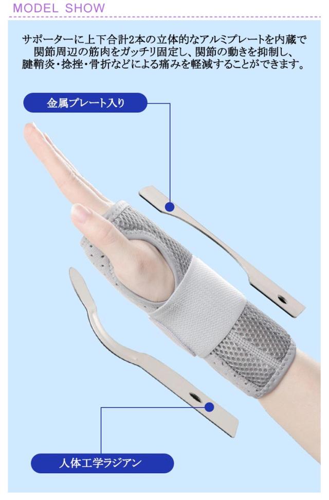 | 家事や子育て中のママ・パソコンのキーボードを打つのがつらい人におすすめ。 長時間着用・スポーツ用に最適♪ サポーターに上下合計2本の立体的なアルミプレートを内蔵で関節周辺の筋肉をガッチリ固定し、 関節の動きを抑制し、腱鞘炎・捻挫・骨折などによる痛みを軽減することができます。 サポーター本体は通気性の良いメッシュ生地を採用。長時間使用していても蒸れにくく快適な着用感が続きます。 マジックテープで簡単に装着できるうえ、激しく動いてもズレにくい設計です。固定力を自由に調節することができます。 テニス・バレーボール・バスケットボール・ゴルフ・ボーリング・バッティングなど手首に大きな負荷がかかる運動をする際に、 関節の可動域を超えて負荷をかけてしまうと、靭帯の損傷や捻挫などの怪我を引き起こしてしまう可能性があります。 そのため、サポーターを手首などの関節周りに装着することで、関節を補強し怪我を未然に防ぐことができるのです。 | |