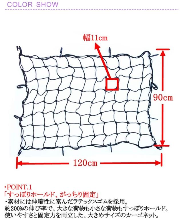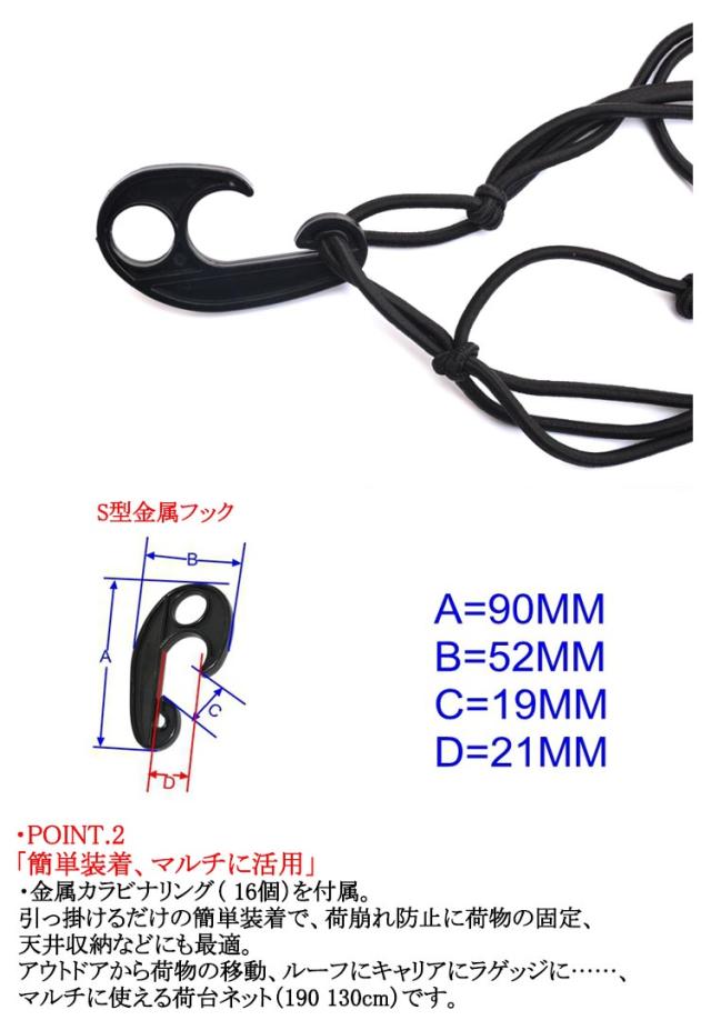 | 90*120cm 伸縮バツグン、マルチに活用。 荷物の固定に、荷崩れ防止に。 スッポリ、ガッチリ、使って。 大判サイズのカーゴネット。 ・POINT.1 「すっぽりホールド、がっちり固定」 ・素材には伸縮性に富んだラテックスゴムを採用。 約200%の伸び率で、大きな荷物も小さな荷物もすっぽりホールド。 使いやすさと固定力を両立した、大きめサイズのカーゴネット。 ・POINT.2 「簡単装着、マルチに活用」 ・金属カラビナリング( 16個)を付属。 引っ掛けるだけの簡単装着で、荷崩れ防止に荷物の固定、天井収納などにも最適。 アウトドアから荷物の移動、ルーフにキャリアにラゲッジに……、 マルチに使える荷台ネット(190 130cm)です。 | |