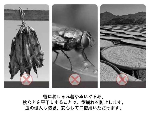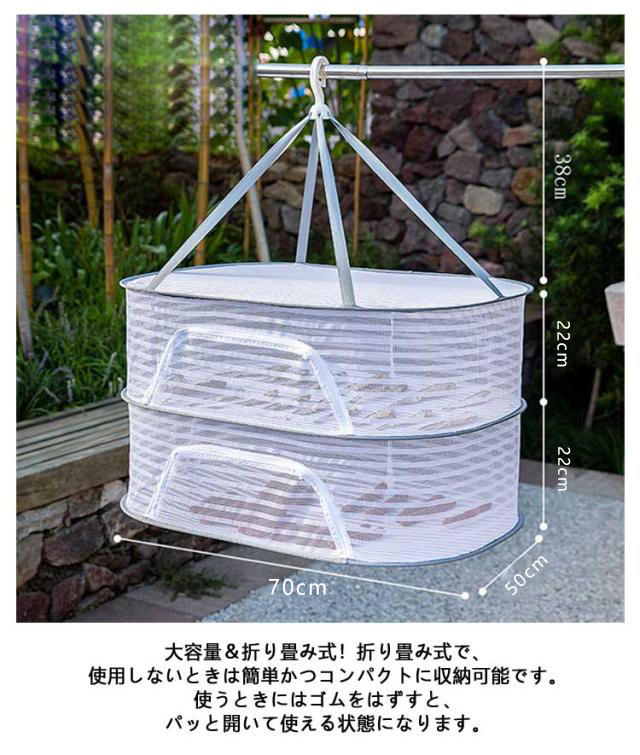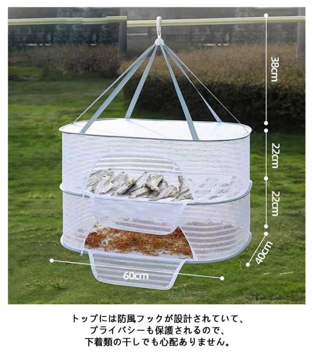 | 多機能!魚、野菜、梅、芋、 ハープの速乾に最適です。また、ブラジャー、下着、編み物、セーター、ぬいぐるみの干しにも役立ちます。特におしゃれ着やぬいぐるみ、枕などを平干しすることで、型崩れを防止します。虫の侵入も防ぎ、安心してご使用いただけます。 風を防ぐカバー付き! 強風時にも安心して使用できる防風カバーが付いています。トップには防風フックが設計されていて、プライバシーも保護されるので、下着類の干しでも心配ありません。折りたたむとコンパクトになり、旅行や出張の際にも便利です。通気性のあるメッシュ構造で、洗濯物が速乾します。 頑丈で耐久性抜群!6本の紐で耐久性がグレードアップ!各段の耐久性も非常に高く、ネット部分にはメッシュ素材のカバーが施されています。これにより、洗濯物が落ちてしまったり、虫の侵入を防ぐことができます。 大容量&折り畳み式!折り畳み式で、使用しないときは簡単かつコンパクトに収納可能です。使うときにはゴムをはずすと、パッと開いて使える状態になります。小さく折り畳むことができるので、場所を取らずに便利です。 ファスナーが付いているため、ぬいぐるみなどが落ちる心配がありません。安心して干せる設計です。 使用シーン!ぬいぐるみ、ニット、下着、梅干し、干し野菜作り、魚干し、干し芋、ハープ、ドライフルーツなど、様々な場面で活躍します。生活のあらゆるシーンで便利に使える「多機能物干しネット」で、日々の家事をもっと快適にしましょう。 | |