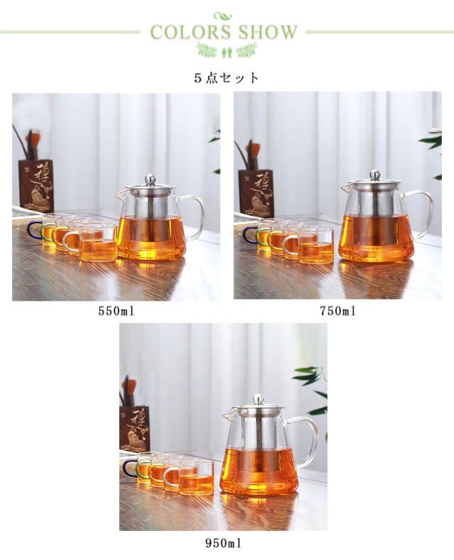 5点セット クリアティーポット カップ付き 耐熱ガラス ティーポット 耐熱ガラス ストレーナー付き ガラス クリアティーポット 急須 紅茶 茶こし付き お茶 直火 キッチン 家庭用品