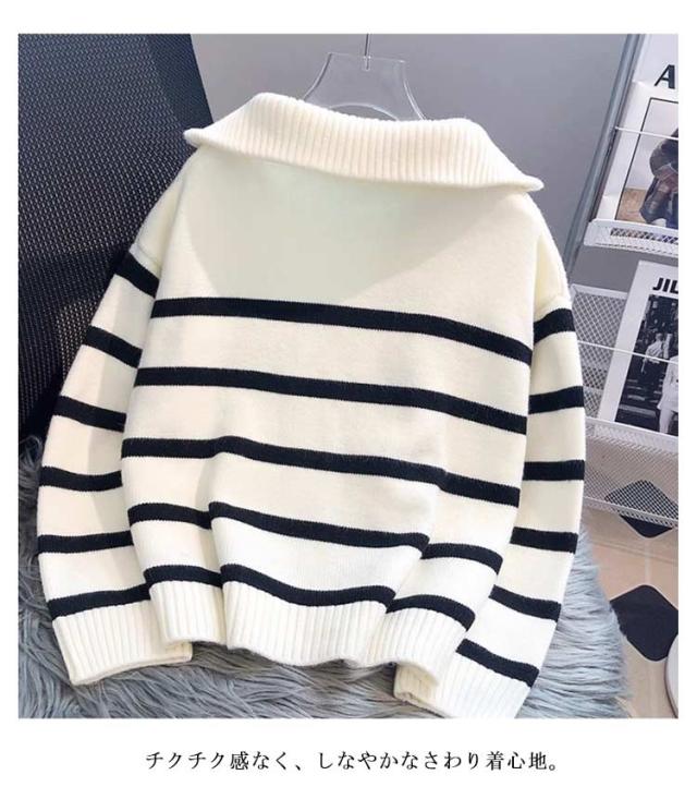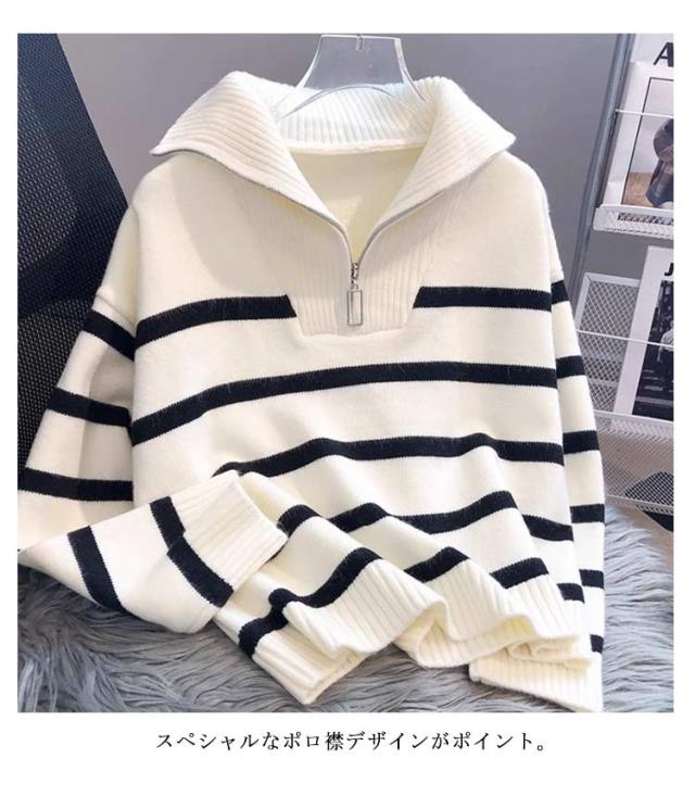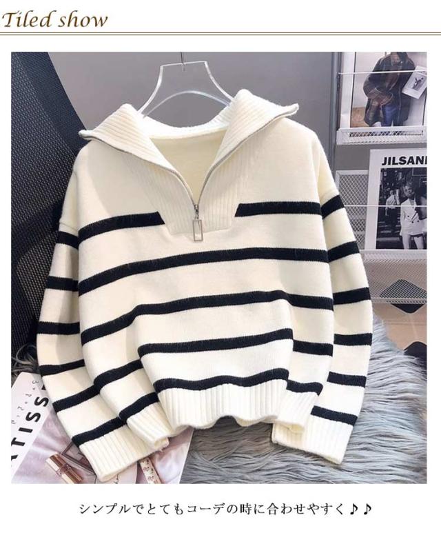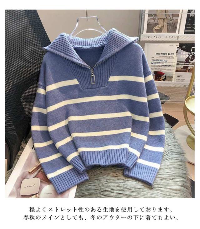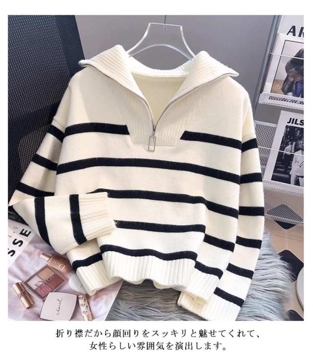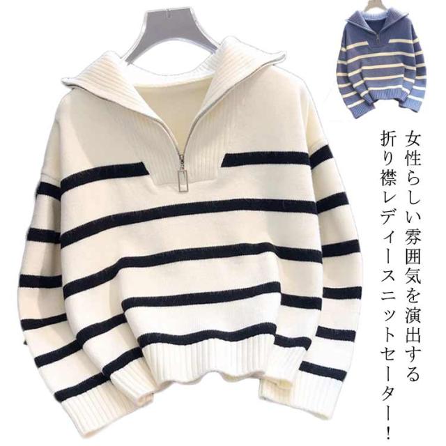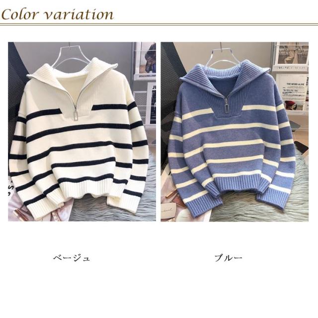 セーター レディース 長袖 カジュアル 秋服 冬服 柔らかい ニットセーター ジップアップ プルオーバー トップス キレイめ ゆったり オシャレ ハーフジップ ストライプ柄 シンプル セーター 通勤 ベージュ ブルー 20代 30代 40代 50代