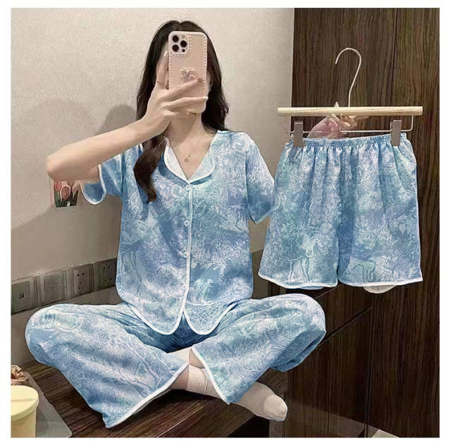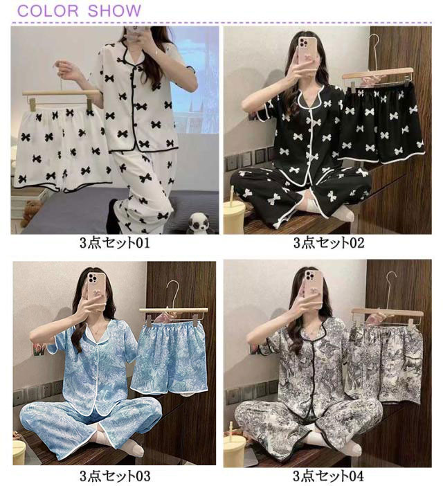 カップ付き 半袖トップス+ショートパンツ+ロングパンツ カップ付き パジャマ パジャマ 3点セット レディース レディース 短パン 部屋着 ルームウェア 半袖 レディース 上下セット ナイトウェア