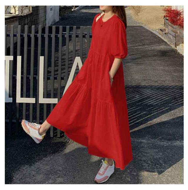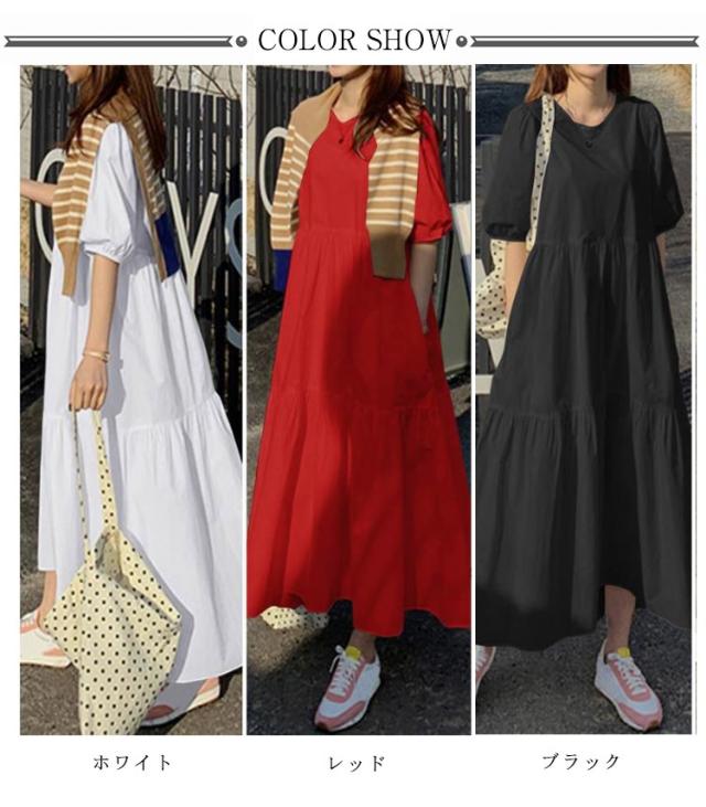 ワンピース 着痩せ ロングワンピース 半袖 ティアード フレア ドッキングワンピース レディース 春 Tシャツワンピ 丸首 tシャツワンピース クルーネック ゆったり 体型カバー 細見え 半袖 ホワイト レッド
