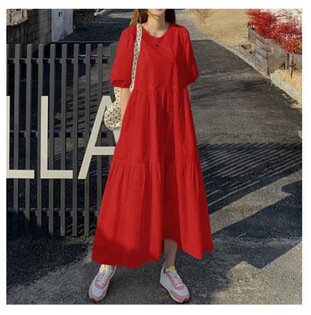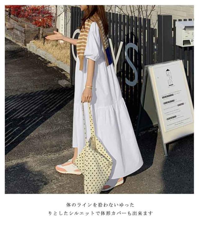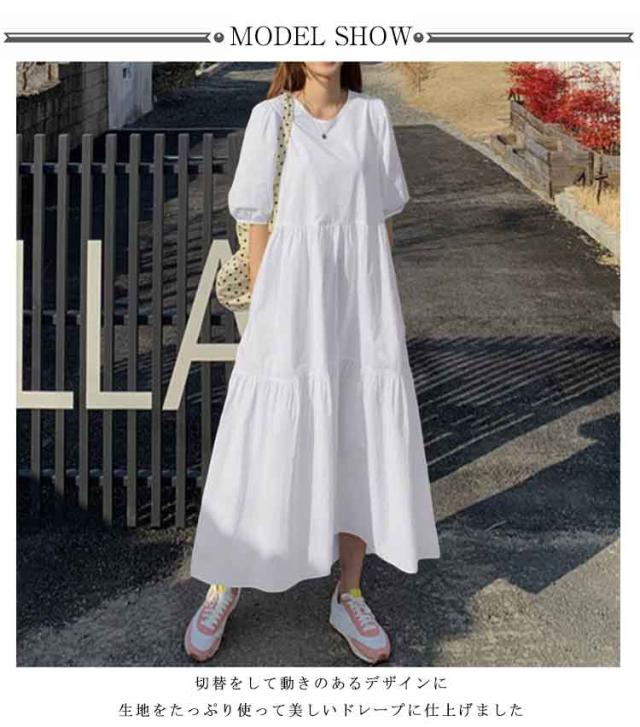 ワンピース フレア ロングワンピース ティアード レディース クルーネック 半袖 ドッキングワンピース 春 半袖 夏 Tシャツワンピ 丸首 ゆったり 体型カバー 細見え 着痩せ ホワイト レッド