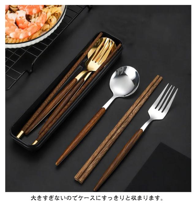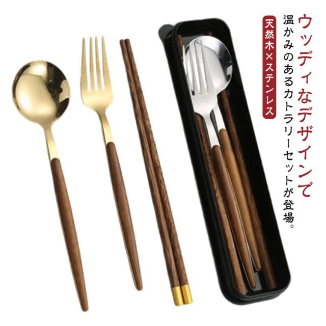 便利 お弁当 ステンレス 木製 北欧 カトラリーセット ゴールド 韓国 カトラリーセット お箸 高級感 フォーク 3点セット 食器 スプーン セット ケース付き コンパクト 持ち運び おしゃれ 携帯 通勤 通学 大人 学生 食洗機対応