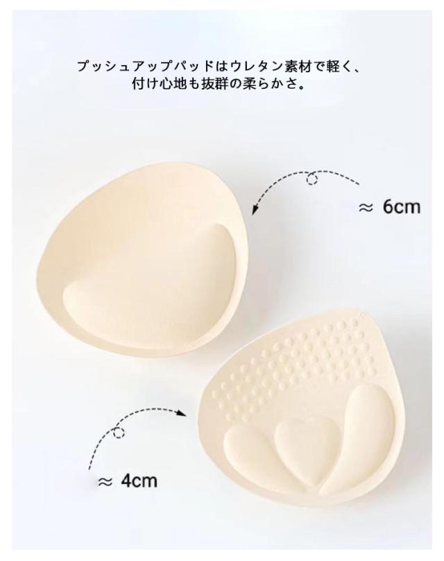 | バストを下辺から持ち上げ、きれいにボリュームアップ! プッシュアップパッドはウレタン素材で軽く、付け心地も抜群の柔らかさ。 弾力性のあるクッションで、バストにもしっかりとフィット! 下辺に厚みを持たせていることで、バストを下から持ち上げ、きれいにボリュームアップしてくれます。 デコルテにボリュームを出したい方や、バストシルエットを美しく見せたい方にもおすすめです。 | |