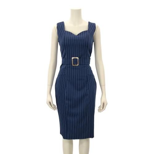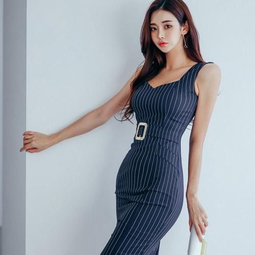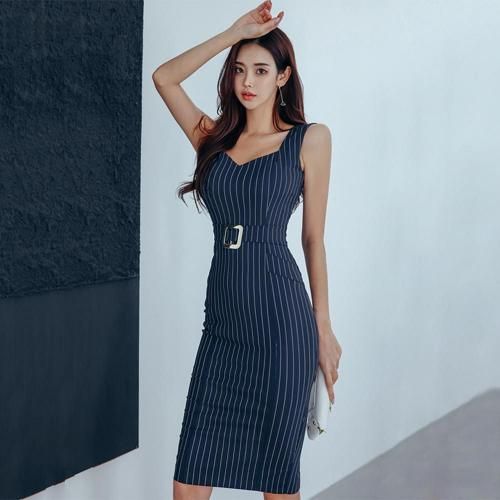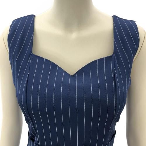 キャバ ドレス キャバドレス ワンピース ミディアムドレス ノースリーブ ハイウエスト カジュアル 細見え ストライプ デコルテ ボディライン メリハリ すっきり 軽やか ネイビー S M L XL