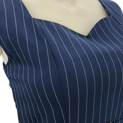 落ち着いたネイビーのカラーにシャープなピンストライプが縦のラインを強調することで細見え効果があり、さらに軽やかなミディ丈にハイウエストのベルト風アクセントが女性らしいメリハリのあるボディラインを演出。
