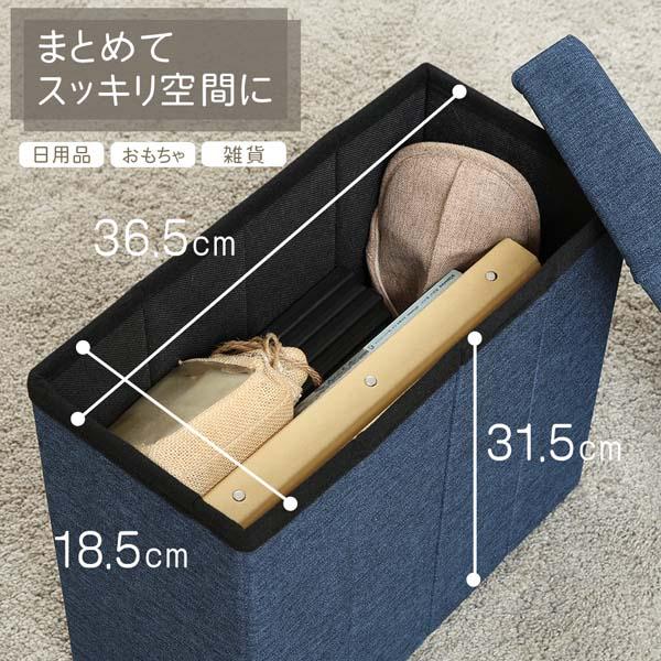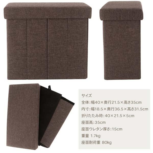 | サイズ | 全体:幅40×奥行21.5×高さ35cm 折りたたみ時:40×21.5×5cm 内寸:幅18.5×奥行36.5×高さ31.5cm 座面高:35cm 座面ウレタン厚さ:15cm MDF(中質繊維板)厚さ:座面5mm、本体3mm、底板2mm |