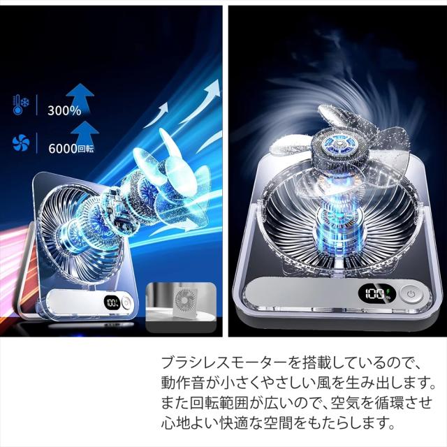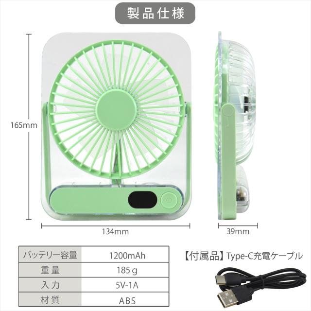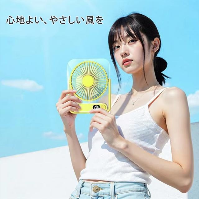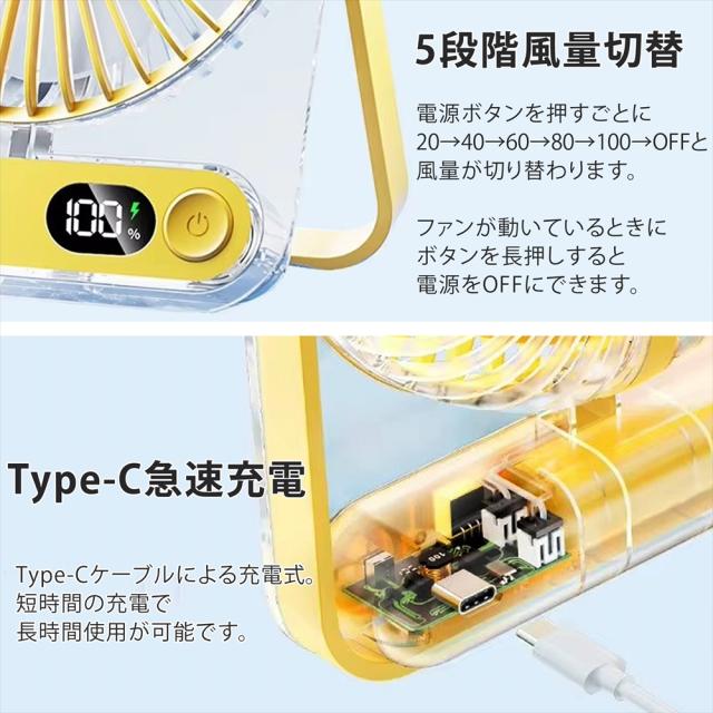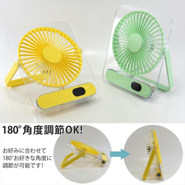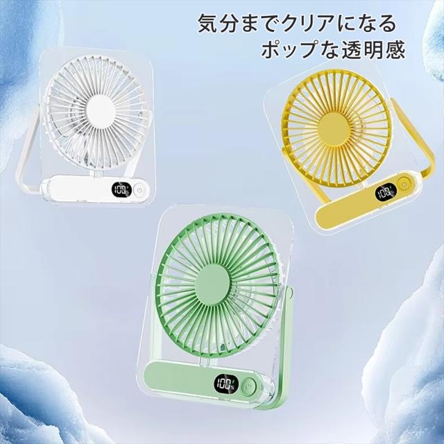 卓上扇風機 小型扇風機 ミニファン 薄型 スリム クリア 静音 5段階風量調節 扇風機 3WAY 卓上 吊り下げ USB充電式 充電残量表示 三角スタンド 角度調整 180° デスクファン コンパクト 39mm コードレス 省スペース 涼しげデザイン 静か