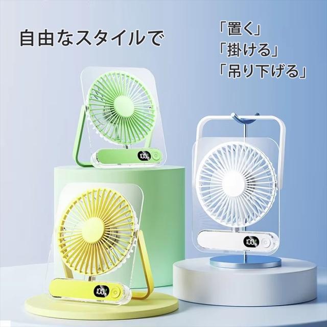 「置く」「掛ける」「吊り下げる」の3通りの使い方ができる、USB充電式デスクトップファン。