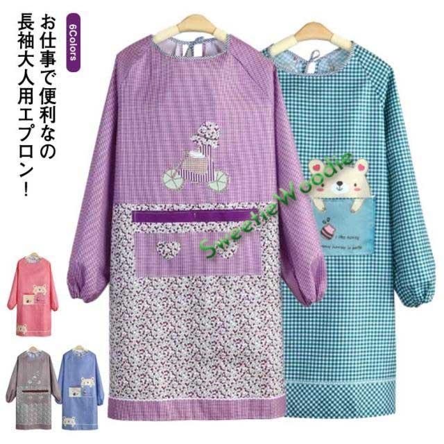 割烹着 おしゃれ エプロン 袖付き レディース かっぽう着 長袖 エプロン 大人用 ロング丈 ネコ 動物柄 チェック ドット ポケット付き 家事 キッチン 保育士 飲食店 看護師 クッキング スモック かわいい ゆったり 大きめ シンプル ガーデニング 料理 BBQ ギフト 送料無料