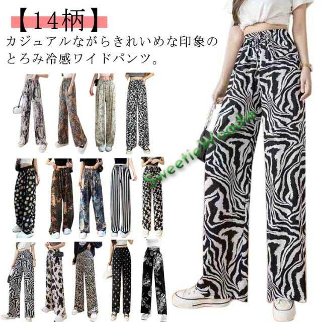 接触冷感 冷感 接触冷感 イージーパンツ 落ち感 部屋着 夏 涼感 ワイド ワイドパンツ パンツ レディース 総柄 ルームウェア ロング シルク 薄手 着?せ 体型カバー ハイウエスト ゴムウエスト ストレッチ リラックス カジュアル ヒョウ柄 ゼブラ柄 花柄