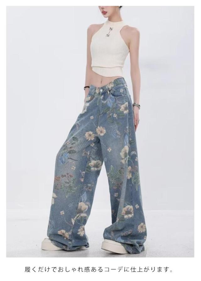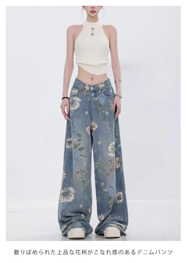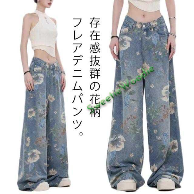 デニムパンツ 大人可愛い ブーツカット ロングパンツ おしゃれ ジーンズ レディース 秋 パンツ マキシ 送料無料 夏 春 デニムワイドパンツ 花柄 シューカットパンツ 長ズボン 存在感 抜け感 韓国ファッション