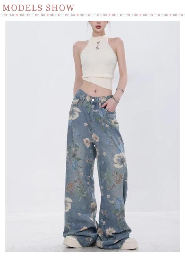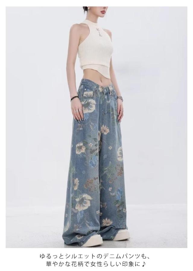 | 存在感抜群の花柄フレアデニムパンツ。 散りばめられた上品な花柄がこなれ感のあるデニムパンツ ゆるっとシルエットのデニムパンツも、華やかな花柄で女性らしい印象に♪ 履くだけでおしゃれ感あるコーデに仕上がります。 | |