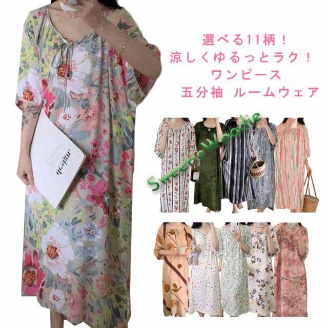寝間着 五分袖 部屋着 半袖 パジャマ ワンピース 春 ワンピース 薄手 大きいサイズ 可愛い ロング丈 花柄 無地 ロングワンピース ゆったり ルームウェア レディース 寝巻き リラックス 体型カバー おしゃれ Vネック ギフト