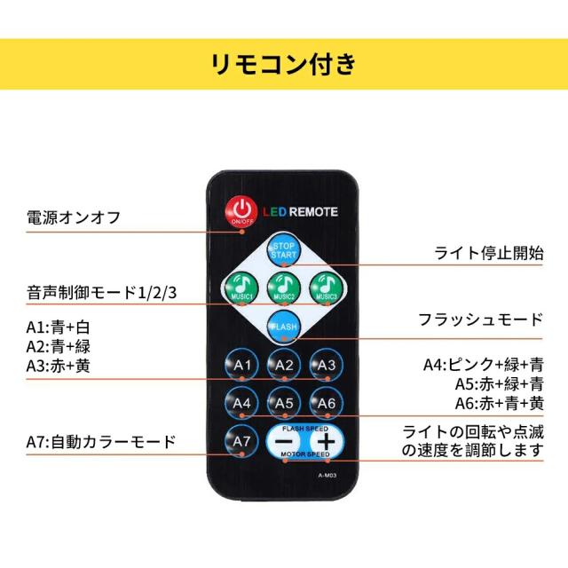 音楽に合わせて光り方が変化し、カラフルな照明が、幻想的なムードを演出してくれるLEDミラーボールです。 【LEDステージライト】:7色組み合わせて、様々なパターンで瞬きます。ランダムに光り輝き、華やかに部屋や壁を彩ります。いいムードも演出することができます。 【3種類モード】:紋様パターン自動モード:ランダムに色が変化します。 音声制御モード:音楽のリズムに合わせてライトが変化します。 フラッシュモード:ライトが素早く順々に点滅します。 【自動回転機能】リモコンにある回転ボタンを押したら、自動回転モードになり、カラー投影が回転します。 ※内蔵のLEDチップの回転になります。 【360度回転&雰囲気作り】スタンド付きで、360度回転できます。空間全体を華やかに照らし出します。パーティーやイベントの時、テンションを盛り上げます。 【リモコン付き 簡単な操作】リモコン付属で、簡単な操作で手軽に光と音を同時に楽しめます。小型で簡単に設置できるコンパクトでパワフルなLEDレーザーライト。リモコン1つで、2台を操作することできますので、非常に便利です。 【様々なシチュエーションで楽しめる】広い照射範囲で、部屋の壁や天井でカラフルなライトが出現します。ステージ、パーティー、カラオケ、ディスコ、クラブ、バー、お家カラオケ、行事、イベント、ダンス、店の入り口などいろいろな場所に適用できます。結婚式、誕生日会、クリスマス、ハロウィン、ホーム飾りなど、景品用としてもお勧めです。 |