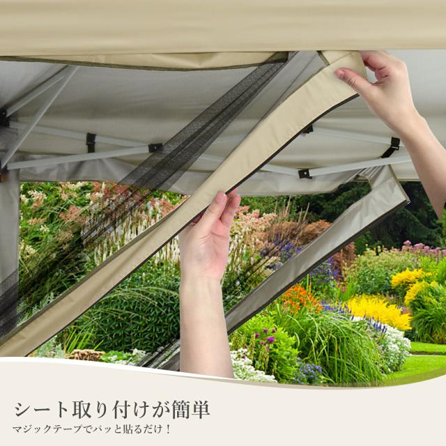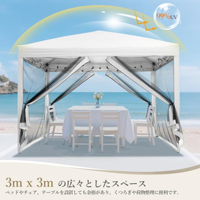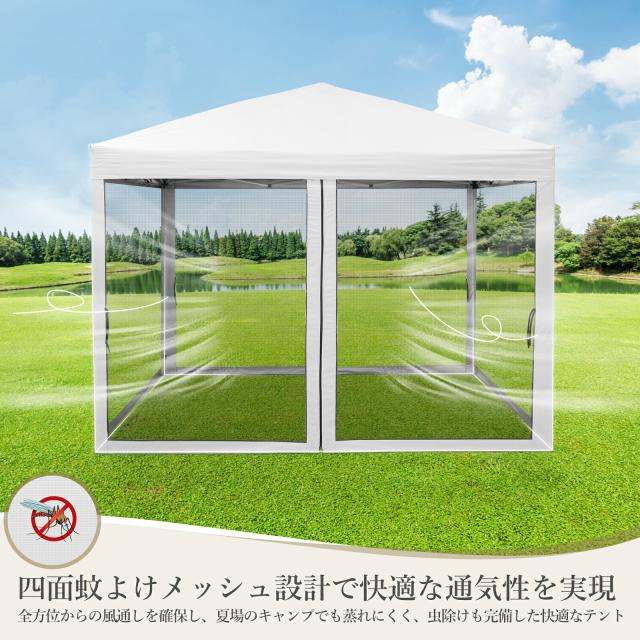 新登場 タープテント 3m×3m ワンタッチテント 蚊よけネット付 横幕セット 頑丈 スチール テント タープ 300cm 大型 UV加工 撥水 ベンチレーション 日よけ イベント アウトドア キャンプ 日除けテント