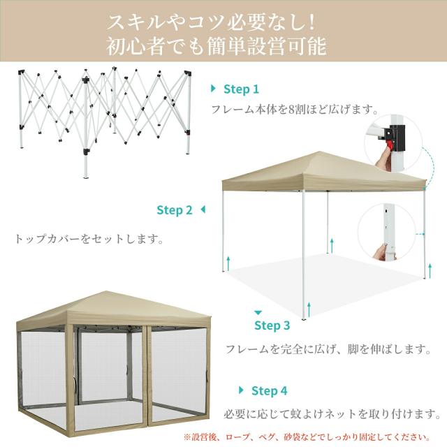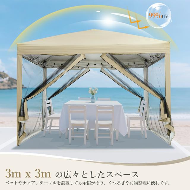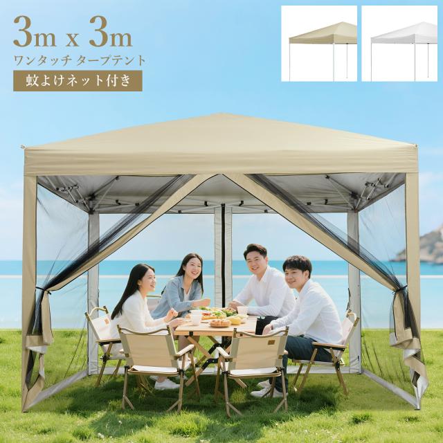 ワンタッチタープテント タープテント 3m×3m 蚊よけネット 頑丈 スチール テント タープ 300cm 大型 UV加工 撥水 ベンチレーション 日よけ イベント アウトドア キャンプ |
