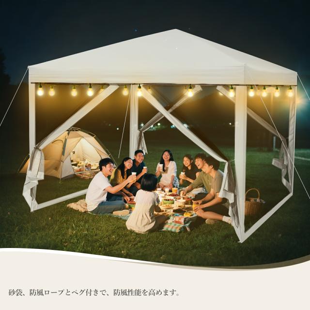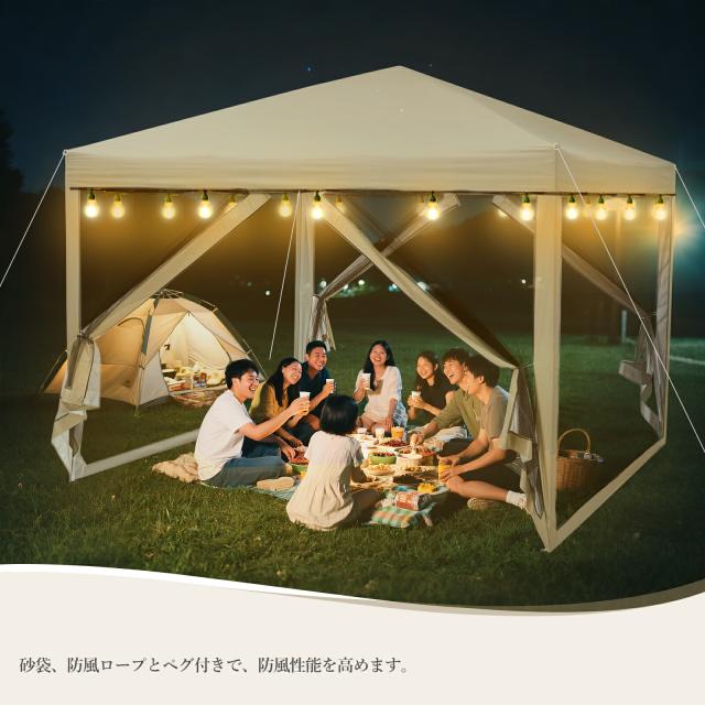 【蚊よけネット付き、3m*3mタープタイプです。】 【広々としたスペース】 3m*3mの広々したサイズで、ベッドやチェア、テーブルを設置しても余裕があり、くつろぎや荷物整理に便利です。 【四面蚊よけ】 全方位からの風通しを確保し、夏場のキャンプでも蒸れにくく、虫除けも完備した快適なテントです。 【粉体塗装された金属鋼フレーム】 粉体塗装は均一で美しい仕上がりを実現し、金属鋼フレームは強固で耐久性があり、長期間安定した使用が可能です。 【シーンに合わせて高さを3段階調節】 ボタンを押して脚を伸ばすだけで簡単に高さ調節できます。 【UVカット生地】 高遮光性とUVカット加工で、直射日光を遮り、日中も涼しく快適に過ごせます。 【高耐水加工】 オックスフォード生地と防水シーム加工で、雨漏れを防ぎ、雨の日でも内部が濡れる心配がありません。 【高い防風性能】 砂袋、防風ロープとペグ付きで、防風性能を高めます。 アウトドアライフをより快適に |