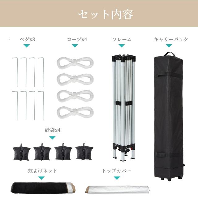 トップカバー、蚊よけネット、フレーム、ロープx4、ペグx8、砂袋x4、キャリーバック |