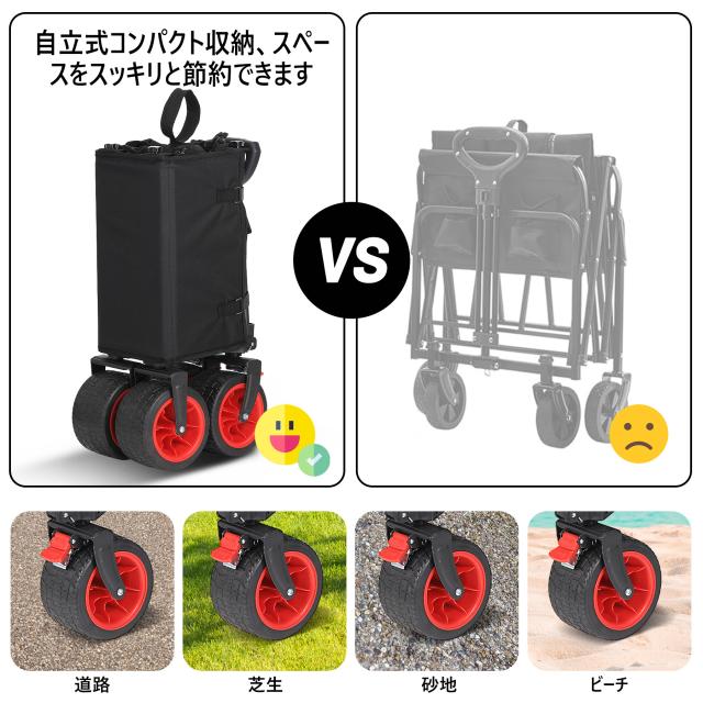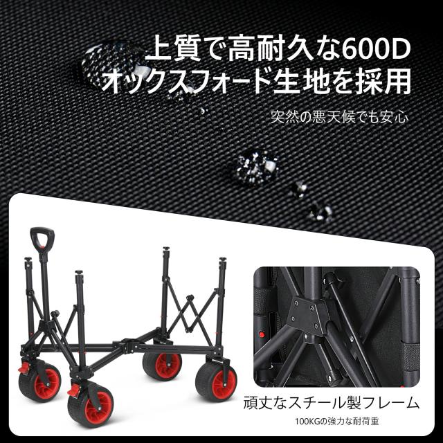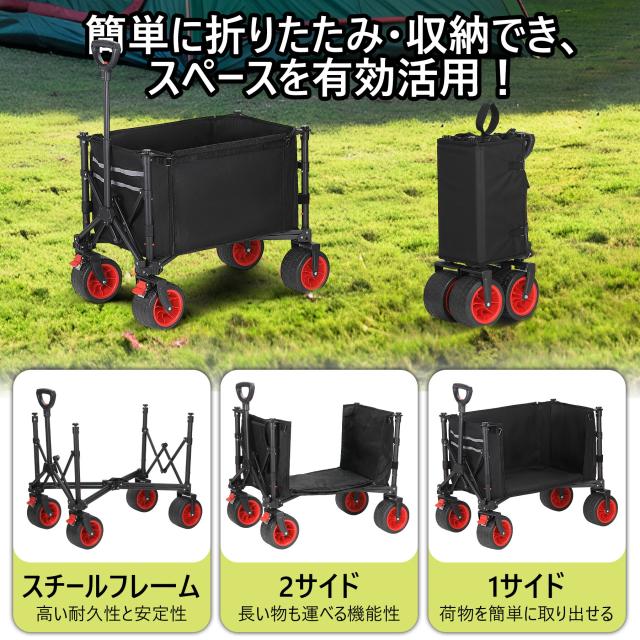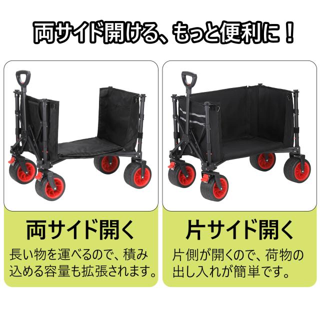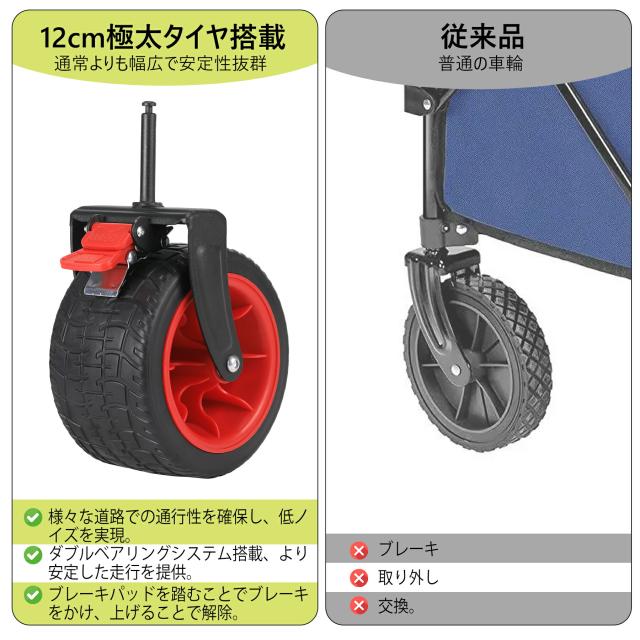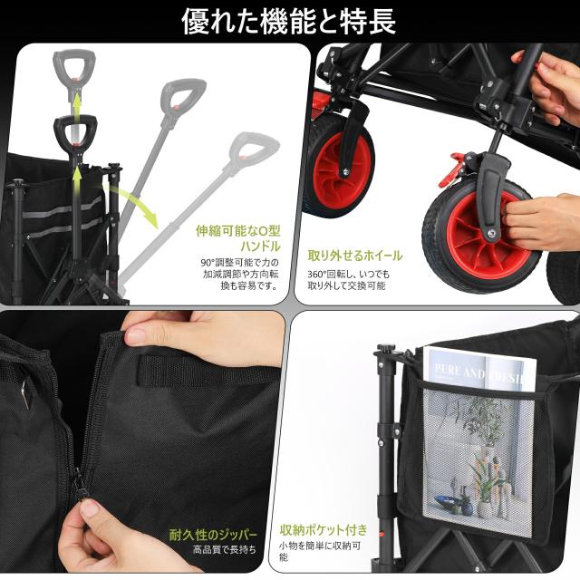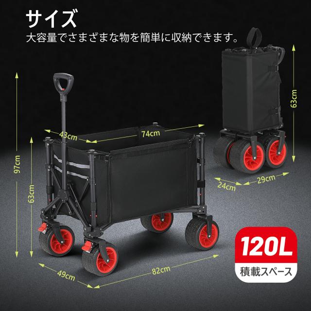 【大容量】 120Lの大容量で、頑丈なフレーム構造を採用し、安定性に優れ、たくさんの荷物をたっぷり詰め込んでまとめて運べます。 【両サイト開ける】 両サイトでも片方サイトでも開けます、荷物の出入がもっと簡単になります。積込容量が拡張され、長物も運べます。 【折り畳み式】 スマートな折り畳み式で、コンパクトに収納できます。 【伸縮可能なハンドル】 O字型ハンドルで片手でも握りやすく、ワゴンを引きやすいです。 63cm-97cm長さ調節可能で、身長に合わせて操作しやすい仕様です。 【取り外し可能なカバー】 カバーは着脱も簡単でお手入れできます。いつも清潔な状態で気持ちよく使えます。 【12cm極太ダイヤ】 幅の太いタイヤを採用し、段差や凸凹道、芝生、砂地など悪路も安定して動かしやすいタイプです。 【ダイヤロック機能】 前輪にストッパーが付いており、少し傾斜のある場所でも安定性を保つことができ、動き出してしまう心配がありません。 【360°自由回転】 前後両方のタイヤは360°自由回転設計で、方向転換がスムーズに行えます。 【メッシュポケット付き】 小物を入れるのに丁度いいポケットが付いています。ちょこちょこ使うものを入れておけば便利です。 【様々なシーンに大活躍】 アウトドア以外でも幅広い荷物の運搬に便利です。 |
