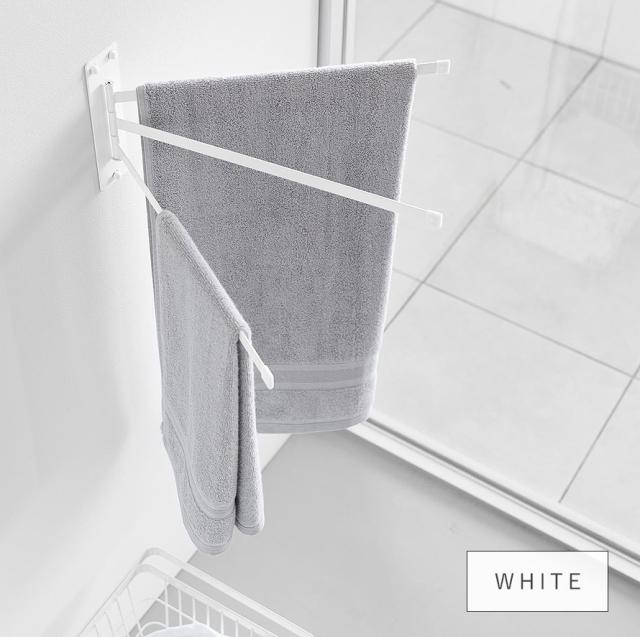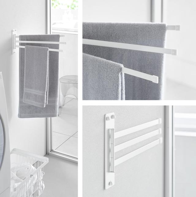 石こうボードピンで壁に簡単取り付け!使わない時はスリムに収納できる室内物干し3連タオルハンガー。