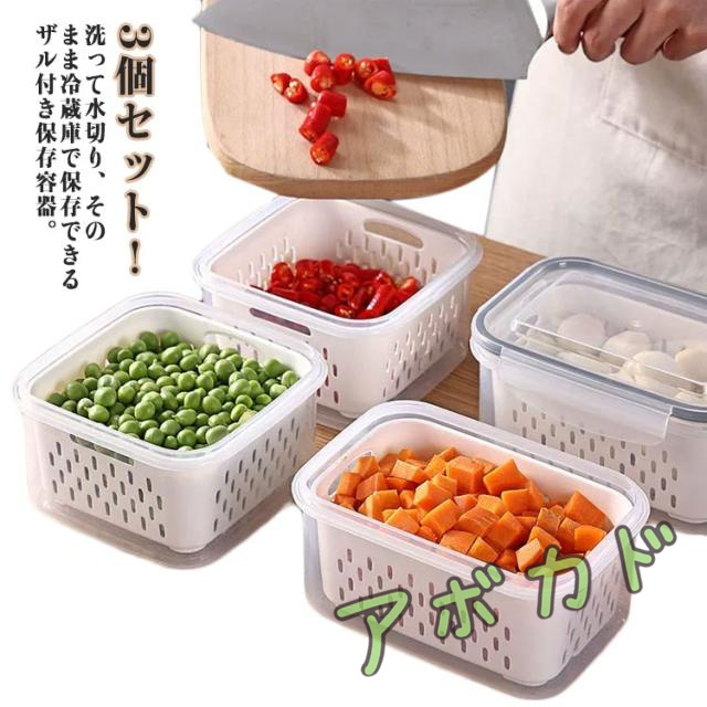 | 3個セット!洗って水切り、そのまま冷蔵庫で保存できるザル付き保存容器。 ボウルとフタ、水切れの良いざるの3つがセットになっており、「洗う」「水切り」「保存」がこれ1つで完結するので手間が省けます。 手軽に食べたい生野菜、レタスやプチトマトなどを洗って水を切りそのまま保存できる保存容器です。 フタは透明にこだわって、中身や鮮度が冷蔵庫に入ったままでも分かりやすいようにしました。 本体とザルはスタッキング出来てコンパクトにまとまります。 | |