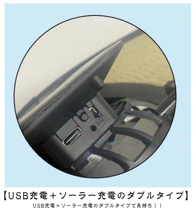 | サイズについての説明 | ※実寸はメジャー採寸の為、若干の誤差が生じる場合があります。 【使用説明】 充電中は赤色ライト、フル使用中は緑色ライト、動作中は緑色ライト (風速1と3のインジケータライトが低速から高速に点滅します) バッテリーを使用するには、トグルスイッチを BAT 位置に回します。 ソーラー給電を使用するには、ドライバーを SUN 位置に設定します。 |