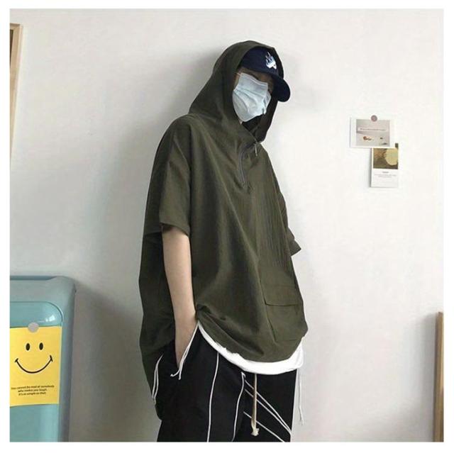 夏 メンズ メンズ 5分袖 半袖tシャツ 韓国 半袖パーカー パーカー 夏用 ボリュームネック ジップ 薄手 フード付き ビッグシルエット 夏 ゆったり ビッグシルエット 男女兼用 パーカー 夏用 ハイネック プルオーバー パーカー ビッグパーカー