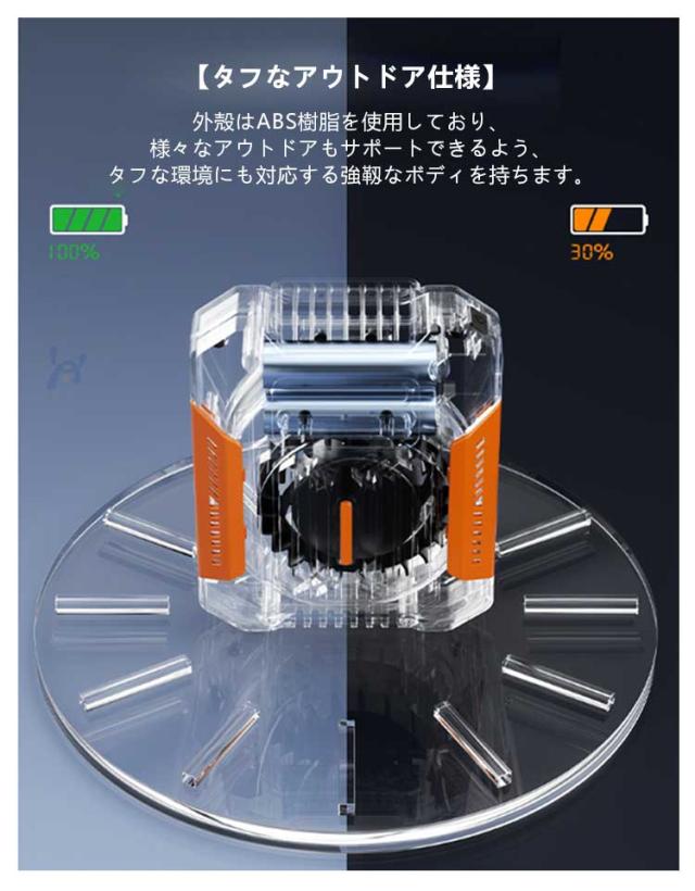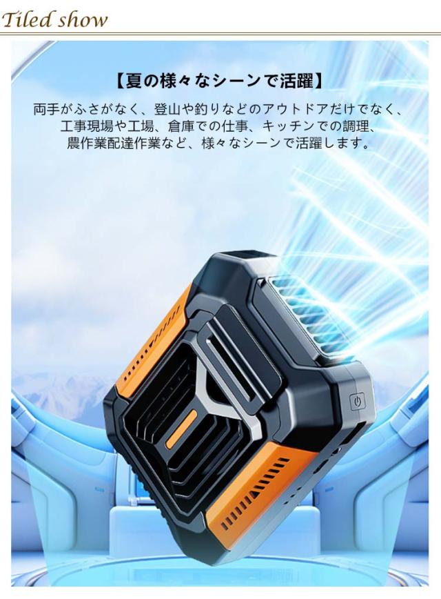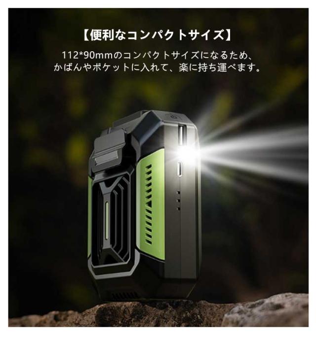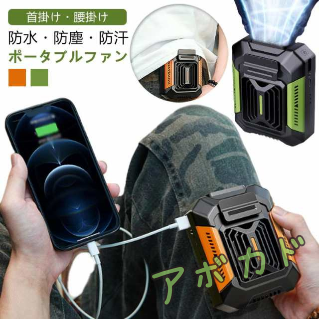 | 風量3段階調節・LED懐中電灯・モバイル電源・4000mAh大容量 防水・防塵・防汗 ポータブルファン 首掛け・腰掛け 【1台4役! 様々な用途に活躍】 腰や首に掛けて両手が使える!また、緊急照明や充電機能付きで、アウトドアや緊急時にも大活躍に間違いなし! ●首掛けファン 両手をふさがず、快適な風を感じます。 ●腰掛けファン たっぶりと涼しい風を服の中に送り込みます。 ●ランタン・懷中電灯 停電時や災害時、暗い夜道を歩く際には非常に便利です。 ● としてスマホやワイヤレスイヤホンなどUSBデバイスに充電可能。 【小さくてもパワフル送風】 強力なブラシレスモーターを使用で低騒音、コンパクト、回転速度が高い省エネ性も優れています。 【独自な強力送風設計】 シロッコファンと螺旋状の送風管設計で、より安定性があり、より均一で密度の高い空気の流れを作り出すととに成功しました。 【ボタン1つで風量調節!】 強・中・弱の3段階に風量を調整することがボタンーつで出来ます。 【使い方いろいろ!】 便利なクリップであらゆる部位に設置可能手を塞ぐ事なく涼しい風を満喫できます。 【停電時や災害時に活躍】 照明と機能搭載 ●ナイトライト 災害や停電時など緊急照明として様々なシーンで活躍します。 ● USB出カコネクターでほとんどのスマホやタブレットのデバイスに充電可能。 【便利なコンパクトサイズ】 112*90mmのコンパクトサイズになるため、かばんやポケットに入れて、楽に持ち運べます。 【タフなアウトドア仕様】 外殻はABS樹脂を使用しており、様々なアウトドアもサポートできるよう、タフな環境にも対応する強靱なボディを持ちます。 【夏の様々なシーンで活躍】 両手がふさがなく、登山や釣りなどのアウトドアだけでなく、工事現場や工場、倉庫での仕事、キッチンでの調理、農作業配達作業など、様々なシーンで活躍します。 【カラーバリエーション】 すっきりしたデザインにシックなカラーで、性別やファッションを問わずお使いいただけます。 | |