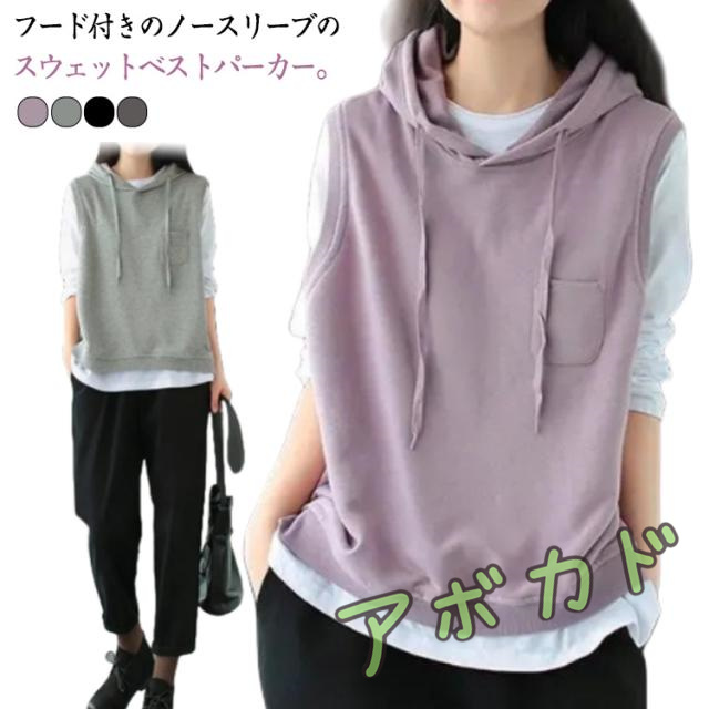 フード付き ノースリーブ ゆったり ベスト パーカー ベスト ノーカラー ポケット付き トップス ベスト フード付き パーカー 重ね着 レイヤード プルオーバー 大きいサイズ 体型カバー お洒落 カジュアル 春 夏 秋 薄手