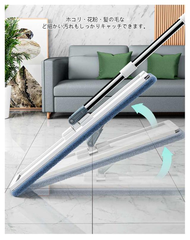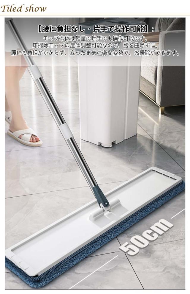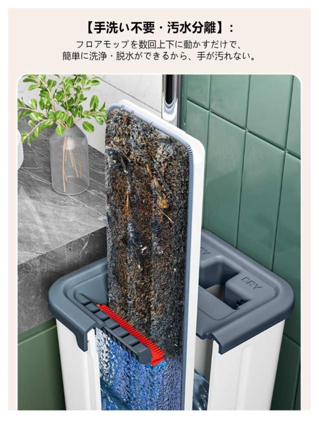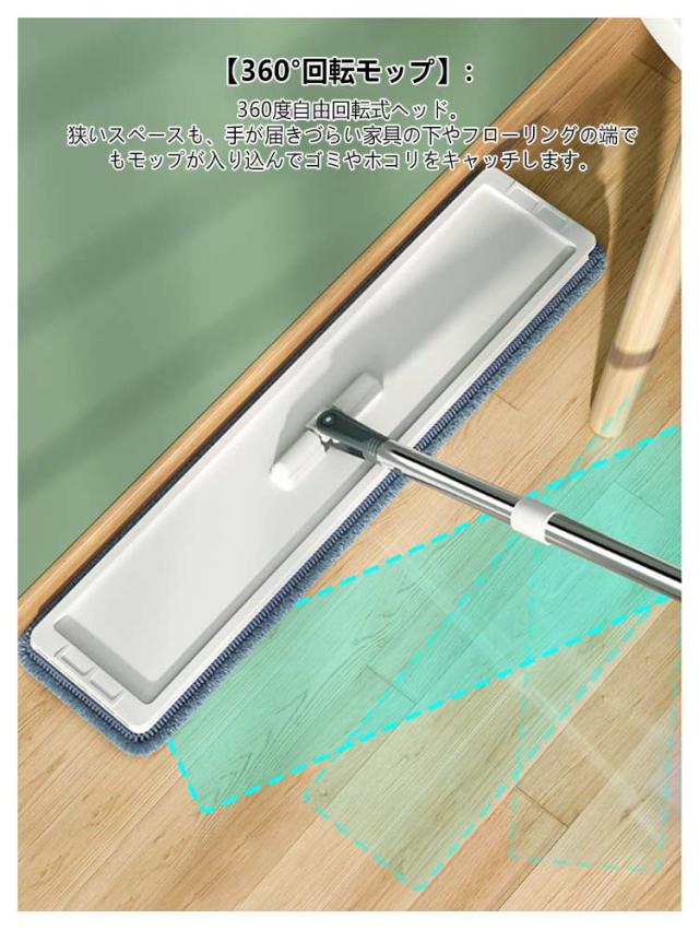 | 【360°回転モップ】:360度自由回転式ヘッド。狭いスペースも、手が届きづらい家具の下やフローリングの端でもモップが入り込んでゴミやホコリをキャッチします。隅々まで綺麗に、角や階段などにもピッタリ。 【腰に負担なし・片手で操作可能】:モップ本体は軽量で片手でも操作可能です。床掃除モップの?度は調整可能なので、腰を曲げずに、腰にも負担がかからず、立ったままの楽な姿勢で、お掃除ができます。 【手洗い不要・汚水分離】:フロアモップを数回上下に動かすだけで、簡単に洗浄・脱水ができるから、手が汚れない。汚水分離のデザインで汚水と清水を分けて集めるから、水滴が飛び散りにくいし、周りを汚さないので、毎日楽に掃除を実現できます。 【4枚取り替えクロス】:交換用クリーニングパッドが4枚付き。簡単に取り付けることができ、手洗いや洗濯機洗いも可能であり、繰り返し使うことができるため、コスパに優れます。乾湿両用なので、すごく便利し実用のフローリング掃除モップです。 【床面保護・収納便利】:パッドはマイクロファイバー素材を採用した、吸水性、耐摩耗性、通気性、耐酸性に非常に優れ、床や壁にも優しいし、特に木製の床面を傷つけずお掃除ができます。ホコリ・花粉・髪の毛など細かい汚れもしっかりキャッチできます。 | |