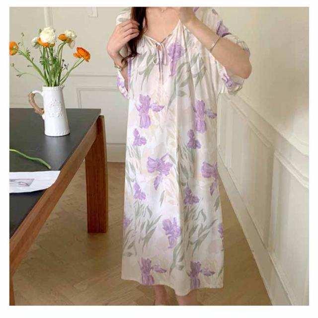 ワンピース パジャマ 無地 春 五分袖 花柄 薄手 部屋着 夏 レディース 半袖 可愛い ロング丈 おしゃれ ロングワンピース ゆったり 大きいサイズ 寝間着 寝巻き リラックス 体型カバー ワンピース Vネック ギフト
