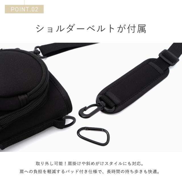長さ調節可能で、肩掛け・斜め掛けスタイルに対応。取り外しも可能。