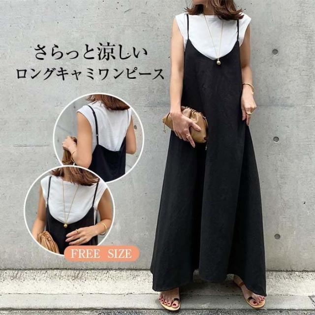 ワンピース ワンピ ドレス フレア キャミ ノースリーブ マキシ 丈 体型 カバー オールインワン 肩ひも 調整 レディース 夏服