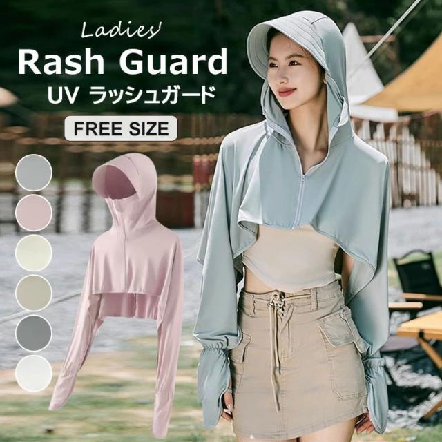 つば広いフードで首や顔まで守れる 6色展開 レディース UVカットケープ 肩掛けラッシュガード 長袖 アウター フード付き 手袋付き ショート丈 クロップド丈 UV帽子 UVケア 自転車 蚊 防虫
