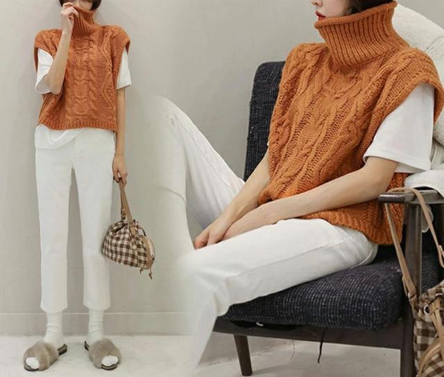 シーズンムードを盛り上げる レディース タートルネック ケーブル ニットベスト ゆったり ハイネックニット ノースリーブ セーター