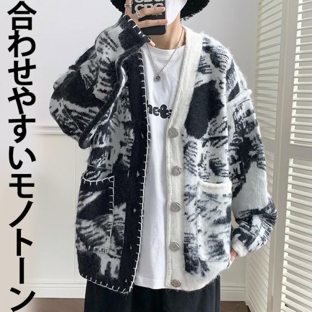 可愛い系男子に 切替がお洒落な柔らか気持ちいいカーディガン アウター ボタン スウェット スエット リブ トレーナー ビッグシルエット ビッグ総柄 大きめ 大きいサイズ 秋 冬 メンズ レディース