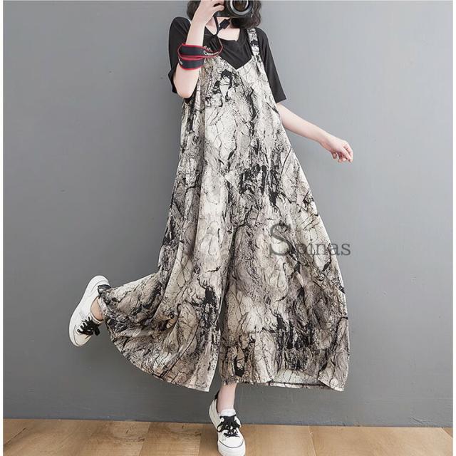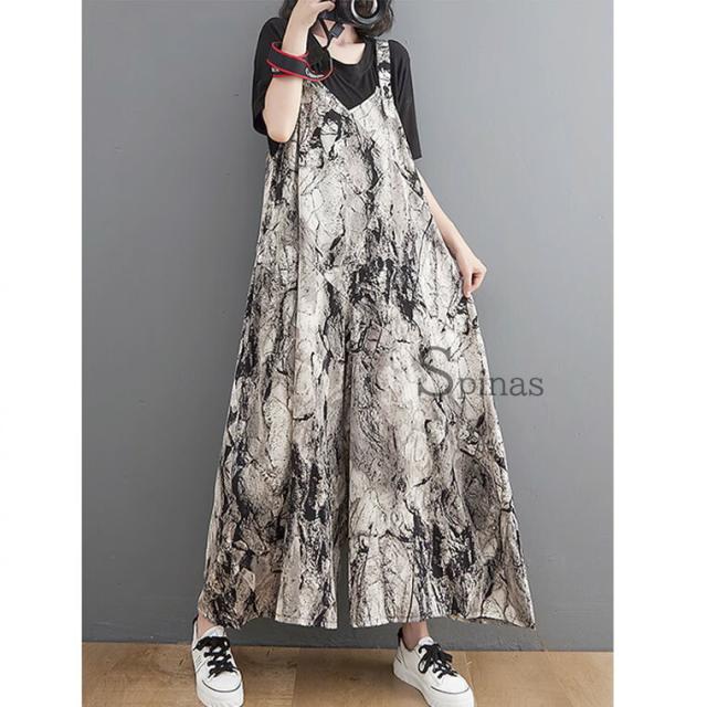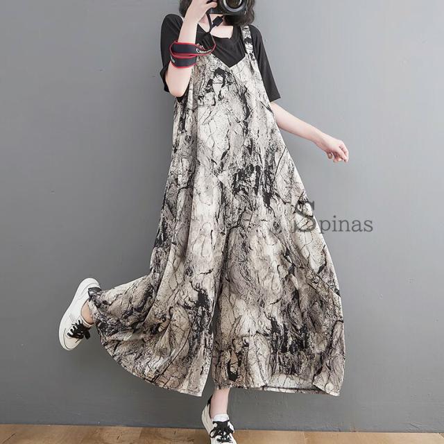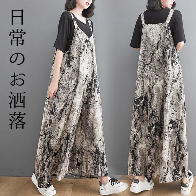 縦長視覚効果 スタイルアップ 40代 50代 ワイドパンツ お洒落ツナギ サロペット レディース つなぎ オールインワン ジャンプスーツ ブラック 黒 超ワイド タイダイ 絞り染め エスニック アジア
