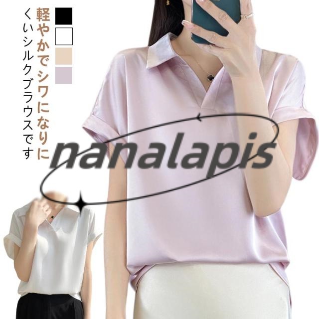 シルク 大きいサイズ ブラウス サテン プルオーバー 襟付き レディース 夏 半袖 tシャツ シャツ シャツブラウス インナー トップス 体型カバー シルク Vネック 柄 花柄 薄手 吸湿 通気性 敏感肌 光沢感 透けない 肌着